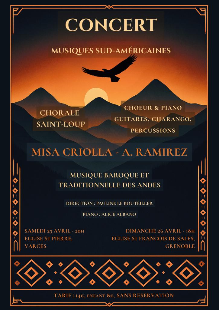 La Chorale Saint-Loup met à l’honneur la musique vocale sud-américaine, mélange de traditions et de styles ancrés dans l’histoire dès la période précolombienne, à la résultante expressive et riche en couleurs. Au programme : extraits de manuscrits péruviens des XVII°-XVIII° siècles, polyphonies issues de la tradition andine, et la Misa Criolla d’Ariel Ramirez (1964). Avec piano, guitares, charango et percussions. Venez nombreux !